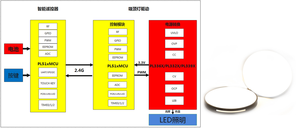 節(jié)能綠色環(huán)保越來越受消費(fèi)者重視, LED作為新的照明產(chǎn)品,滿足現(xiàn)今消費(fèi)者需求,而LED智能照明也成為家居日常不可或缺產(chǎn)品,使用PL51WT020設(shè)計(jì)的吸頂燈方案,實(shí)現(xiàn)燈光的亮度、顏色、定時(shí)關(guān)燈等功能無線控制,遙控器做成隨意貼方式,可以安裝在家居環(huán)境內(nèi)任意位置,不受方向障礙物等影響控制效果。