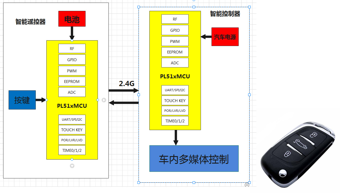 當前汽車用戶越來越多,汽車電子發展迅速,車內多媒體控制繁瑣多樣,使用PL51WT020設計的汽車遙控器,很好地解決車內多媒體等功能無線控制,遙控器做成隨意貼方式,可以安裝在車內任意位置,不受方向障礙物等影響控制效果。